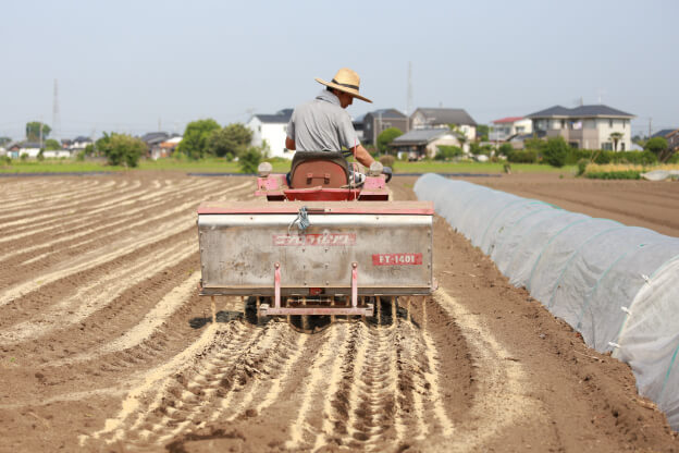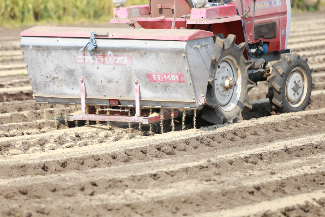 須崎農園では作土の基本的な体力づくりとして、普段から米ぬかやもみ殻といった有機物を少しずつ、延々と投入し、土づくりを行っています。作付けの前には土壌の深いところまで空気がいくよう部分深耕を行い、ふかふかの土のベッドを作り、作物に合わせた栄養分を計算しながら有機肥料を散布、丁寧に耕した後作付けしています。